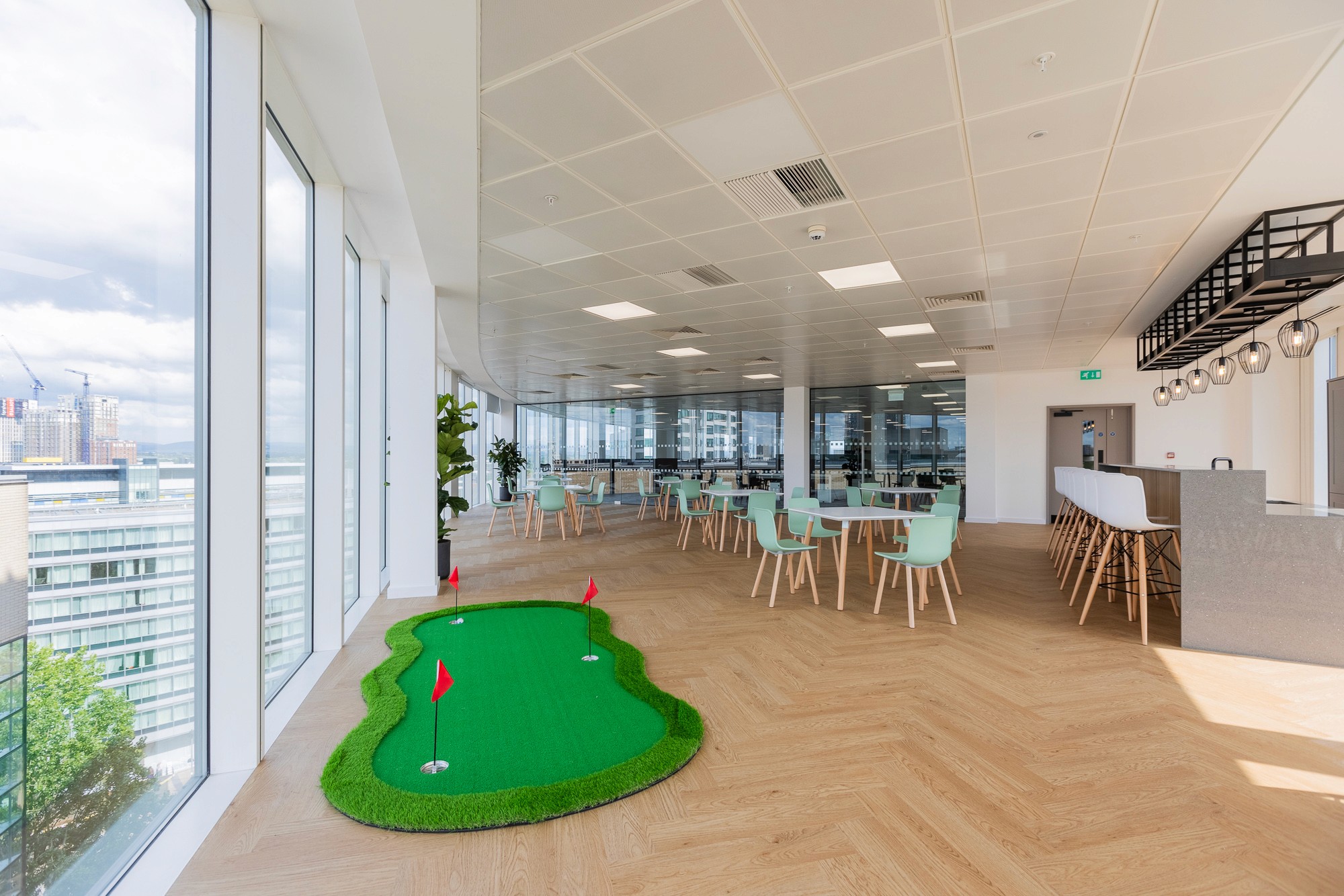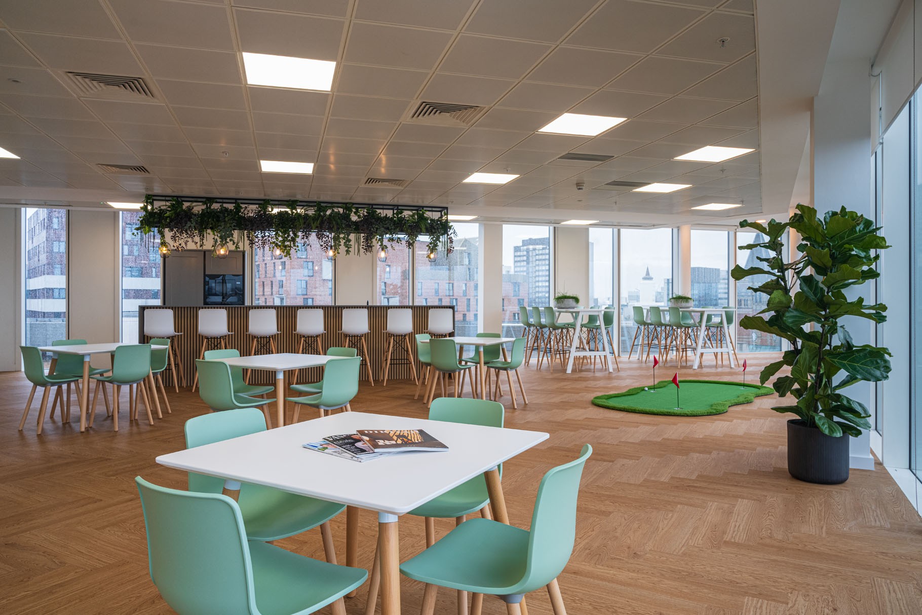 The project included the complete redesign and build of lift lobbies, WCs, shower facilities, and office suites, all finished to a high specification. A standout feature of the scheme was our strategic use of natural light and the careful framing of stunning views across central Manchester—maximising the impact of this elevated location.